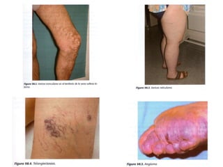 El documento proporciona una revisión histórica de los conocimientos sobre la insuficiencia venosa crónica desde el antiguo Egipto hasta el siglo XIX. Luego describe la anatomía del sistema venoso, los factores de riesgo, manifestaciones clínicas, clasificaciones, diagnóstico y tratamientos de la insuficiencia venosa crónica, incluidos enfoques quirúrgicos y no quirúrgicos.