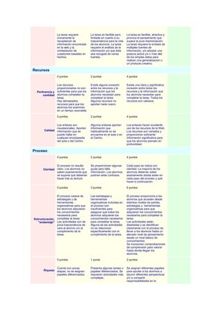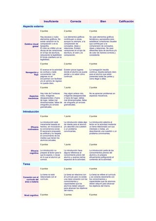 El documento presenta una rúbrica para evaluar diferentes aspectos de una actividad educativa digital como la estética visual, la navegación, los aspectos mecánicos, la introducción, la tarea, los recursos, el proceso y la evaluación. Se evalúa cada aspecto asignando puntos de 0 a 4 o 6 dependiendo de criterios como la claridad, la estructuración, la riqueza y la calidad.
