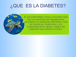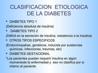 Este documento trata sobre la diabetes. Explica que existen diferentes tipos de diabetes como la tipo 1, tipo 2 y diabetes gestacional. Detalla los métodos para diagnosticar la diabetes como exámenes de glucosa en ayunas y pruebas de tolerancia a la glucosa. También describe los síntomas clásicos de la diabetes conocidos como las 4P y los tratamientos basados en dieta, ejercicio e insulina.