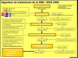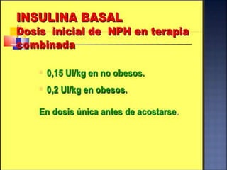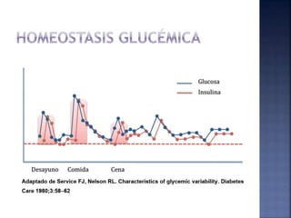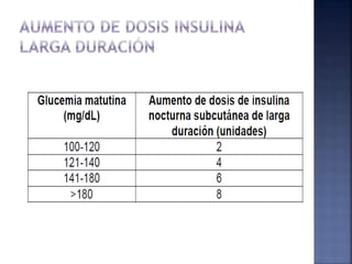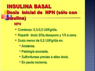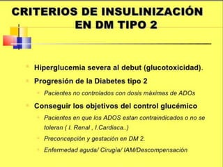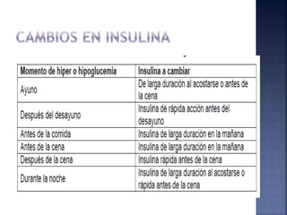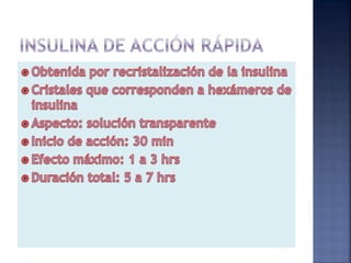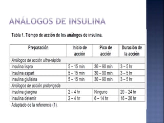 El documento resume la historia y tipos de insulina. Banting y Best aislaron la insulina por primera vez en 1921 y la primera inyección de insulina fue en 1922. Existen insulinas convencionales, análogos de insulina y premezcladas. Las insulinas se clasifican por su inicio, pico y duración de acción.