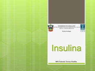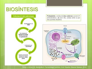 El documento describe la insulina, incluyendo su biosíntesis en las células β del páncreas, su secreción fisiológica en dos fases, y sus efectos fisiológicos y farmacológicos como la regulación del metabolismo de carbohidratos, grasas y proteínas. También discute los tipos y formas de insulina, sus reacciones adversas como la hipoglucemia, sus indicaciones y la administración de la insulina.