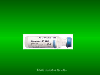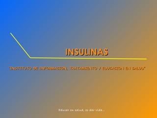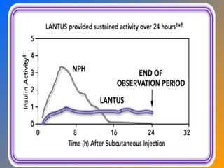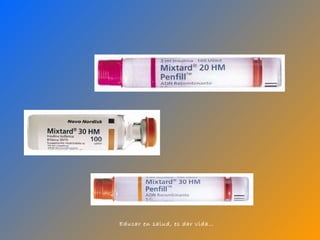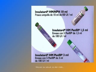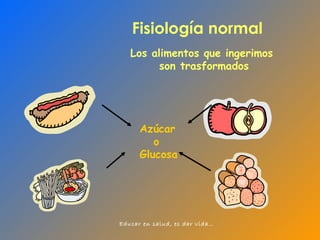 El documento describe la función del páncreas en la producción y secreción de insulina, una hormona clave en la regulación de los niveles de glucosa en la sangre. Explica que las células beta en los islotes de Langerhans del páncreas producen insulina, la cual permite que la glucosa ingrese a las células del cuerpo. También describe los diferentes tipos de diabetes y el papel de la insulina como tratamiento, especialmente en la diabetes tipo 1 donde hay una deficiencia en la producción de insulina.