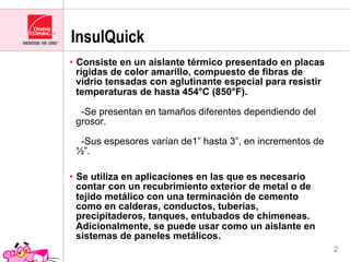 InsulQuick es un aislante térmico compuesto de fibras de vidrio tensadas con aglutinante que puede resistir temperaturas de hasta 454°C. Se presenta en placas rígidas de color amarillo en diferentes espesores de 1 a 3 pulgadas. Se utiliza para aislar calderas, conductos, tuberías y otros equipos industriales expuestos a altas temperaturas. Proporciona máximo aislamiento térmico, es ligero y fácil de instalar con baja generación de polvo.