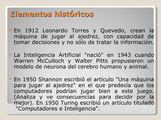 El documento presenta una introducción a la historia y conceptos fundamentales de la inteligencia artificial. Brevemente describe algunos hitos históricos clave como la creación de la primera máquina de ajedrez en 1912 y el estudio seminal sobre el tema en 1956. Explica que la IA busca duplicar facultades humanas como el razonamiento y la toma de decisiones mediante sistemas computacionales. Finalmente, menciona algunas aplicaciones importantes como la robótica, el procesamiento de lenguaje y sistemas expertos.
