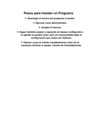 Para instalar un programa, se debe descargar el archivo, ejecutarlo como administrador, aceptar la licencia y seguir las instrucciones hasta que se complete la instalación.