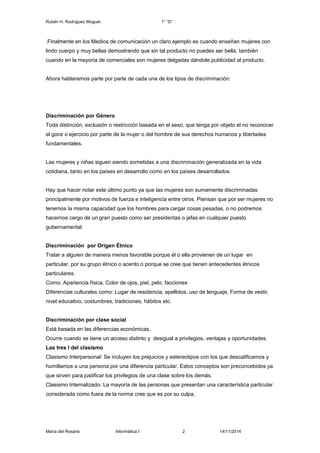 Este documento discute la discriminación por género y los diferentes tipos de discriminación, incluyendo la discriminación por origen étnico, clase social, orientación sexual, VIH/SIDA, discapacidad, religión y edad. Explica cada tipo de discriminación y da ejemplos. También propone actitudes como el respeto mutuo y cuestionar los estereotipos para promover una sociedad libre de discriminación.