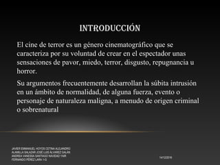 El documento resume los efectos psicológicos y físicos que pueden causar las películas de terror, especialmente en niños y personas con problemas de salud. Explica que las películas de terror pueden producir miedo, ansiedad, insomnio y otros trastornos mentales, e incluso la muerte en personas con problemas cardíacos. También argumenta que este género cinematográfico no es apropiado para menores debido a que pueden desarrollar traumas, cambios de comportamiento e incluso violencia y que los padres deben