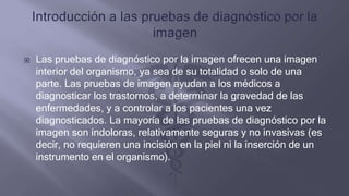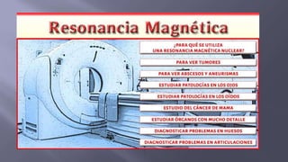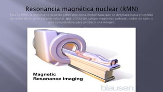 Las pruebas de diagnóstico por imagen como la resonancia magnética nuclear (RMN) ofrecen imágenes detalladas de los tejidos blandos internos utilizando campos magnéticos y ondas de radio. La RMN es útil para examinar el cerebro, médula espinal, músculos e hígado y puede utilizarse con agentes de contraste para mejorar las imágenes. Aunque la RMN proporciona imágenes detalladas, el procedimiento toma más tiempo que otras pruebas de imagen y puede causar claustrofobia