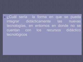 Este documento analiza cómo integrar didácticamente las nuevas tecnologías en entornos con pocos recursos tecnológicos. Reconoce que los estudiantes no tienen acceso a la tecnología más avanzada y propone variables a considerar como las capacidades de los estudiantes, limitaciones físicas, factores culturales, desarrollo socioeconómico y situación de los sistemas educativos. También sugiere pasos como solicitar equipos a organizaciones, adecuar infraestructura, capacitar al personal y motivar un cambio