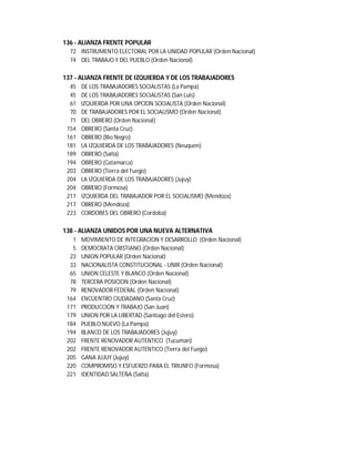 El documento enumera diversas alianzas políticas y partidos en Argentina, organizados según su denominación y categoría. Se presentan múltiples alianzas como 'Frente para la Victoria', 'Cambiemos', y 'Frente de Izquierda', junto con sus respectivas bases y movimientos. La información sugiere un extenso panorama del sistema político y electoral en el país.