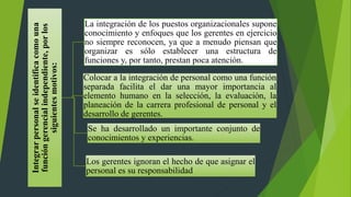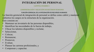 La integración de personal se define como cubrir y mantener cubiertos los cargos en la estructura organizacional mediante actividades como mantener un inventario de personal, identificar necesidades, reclutar, seleccionar, colocar, remunerar, promover, evaluar y capacitar al personal. Un enfoque sistémico es importante para esta función gerencial considerando factores internos y externos que la afectan.
