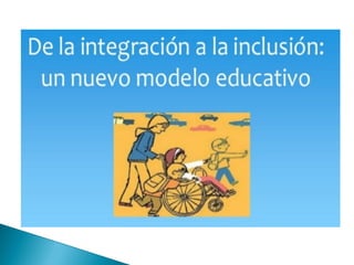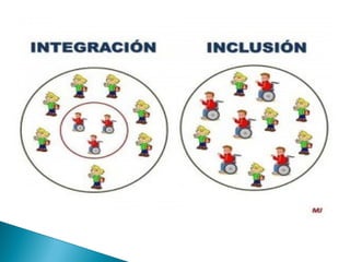 El documento describe las características de una institución educativa inclusiva. Señala que el equipo directivo debe dar ejemplo con acciones inclusivas y que el proyecto curricular debe ser abierto y flexible. También menciona que los profesionales deben elaborar programas educativos individualizados y ampliar su rol de apoyo al alumnado y familias. Además, resalta la importancia de la participación del alumnado, familias y la comunidad educativa para fomentar una sociedad más justa e inclusiva.
