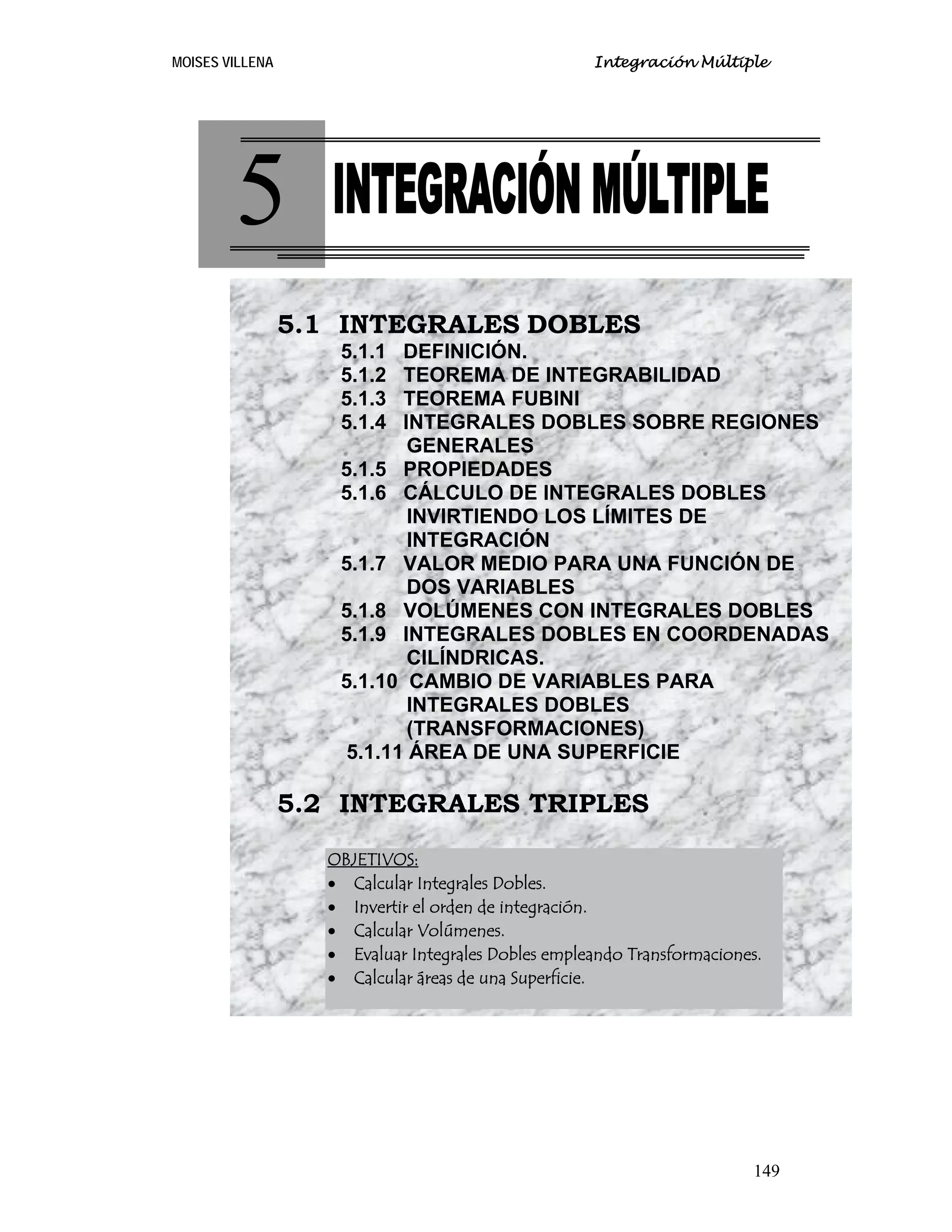El documento presenta los conceptos básicos de las integrales dobles. Introduce la definición de integral doble y los teoremas de integrabilidad y Fubini que permiten evaluar integrales dobles como integrales iteradas. Explica cómo calcular integrales dobles sobre regiones generales y presenta ejemplos resueltos de cálculo de integrales dobles. El objetivo es que los estudiantes aprendan a calcular integrales dobles y a evaluarlas mediante el cambio de orden de integración.