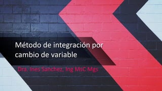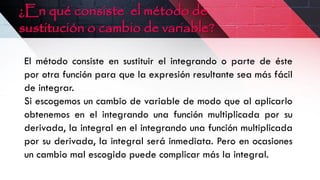 El documento explica el método de integración por cambio de variable, donde se sustituye el integrando o parte de él por otra función para facilitar la integración. Se detalla cómo identificar la nueva variable y su diferencial, y luego aplicar el cambio de variable para resolver la integral. Se proveen 4 ejemplos resueltos usando este método.