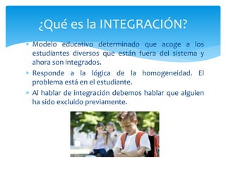 Este documento describe la evolución del modelo educativo de la integración a la inclusión. Explica que la integración requiere que los estudiantes se adapten al sistema existente, mientras que la inclusión busca modificar el sistema para responder a la diversidad de necesidades de todos los estudiantes. También describe las características clave de una institución educativa inclusiva, incluyendo el compromiso de toda la comunidad educativa y el enfoque en las necesidades individuales de cada estudiante.