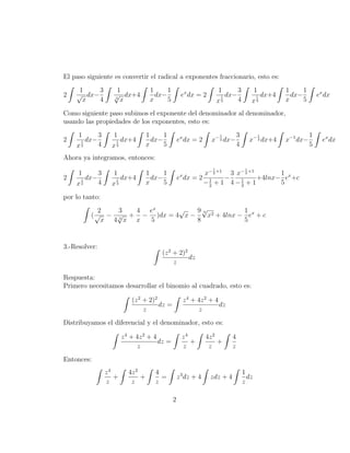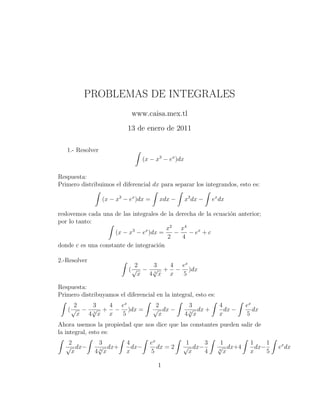 El documento presenta 5 problemas de integrales y sus respectivas soluciones. Cada problema involucra distribuir el diferencial, aplicar propiedades de exponentes, y realizar sustituciones para resolver las integrales de funciones trigonométricas y exponenciales. Las respuestas proporcionan los pasos detallados para llegar a la solución de cada integral planteada.
