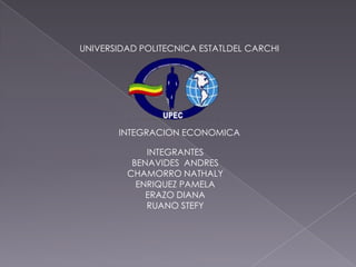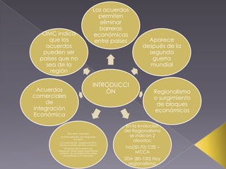 Este documento resume los conceptos clave de la integración económica, incluyendo las formas de integración como mercados comunes, uniones económicas y monedas únicas. Explica los efectos de la integración como la creación de comercio a través de la eliminación de barreras, y los costos como la distribución desigual de beneficios. También analiza las teorías subyacentes de la integración y los factores que impulsan la formación de bloques económicos regionales.