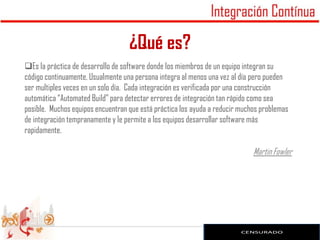 El documento habla sobre las integraciones continuas, que implica que los miembros del equipo integran su código diariamente para detectar errores tempranamente. Esto ayuda a reducir problemas de integración y permite desarrollar software más rápido. Las integraciones continuas involucran poner el código en un repositorio central y automatizar el proceso de compilación.