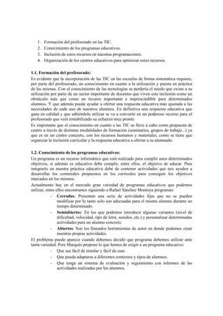 Este documento discute la integración curricular de las tecnologías de la información y la comunicación (TIC) en la educación. Propone cuatro pasos clave para una integración exitosa: 1) formación del profesorado en TIC, 2) conocimiento de programas educativos, 3) inclusión de recursos TIC en las programaciones, y 4) organización de los centros educativos para optimizar los recursos TIC. El objetivo final es usar las TIC como herramientas educativas para satisfacer mejor las necesidades individuales de los estudiantes.
