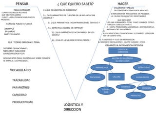 Este documento trata sobre logística y sus procesos. Habla sobre los recursos necesarios como medios, instalaciones, equipo humano e información para responder a la demanda del mercado de manera óptima. También menciona la importancia de satisfacer las necesidades de producción con menor costo y de mantener la flexibilidad, optimización, fiabilidad y sinergia en la coordinación de recursos y demanda. El documento busca investigar sobre los procesos logísticos, el servicio al cliente, estrategias de mercadeo y cómo la logíst