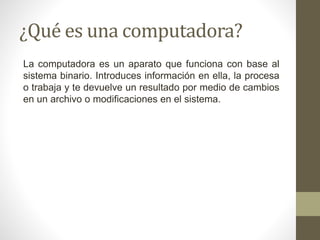 Este documento describe las partes principales de una computadora y cómo funciona. Explica que una computadora procesa información introducida por el usuario a través de hardware de entrada, almacenamiento y salida. También describe un ejemplo de computadora de primera generación que usaba tubos de vacío, y una computadora portátil moderna.