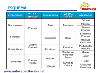 El documento analiza la integración de ingenieros en empresas industriales, resaltando la importancia de alinear las expectativas personales con los objetivos empresariales, así como de fortalecer la productividad y la efectividad profesional. Se discuten los elementos clave del entorno empresarial, la estructura organizativa y las debilidades y fortalezas de los empleados, proponiendo un enfoque basado en la gestión del conocimiento y la motivación. Finaliza enfatizando la relevancia de la inteligencia emocional y el desarrollo integral como factores determinantes del éxito profesional.