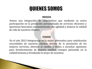Integracoop es una cooperativa que ofrece préstamos rápidos de entre $500.000 a $60'000.000 con plazos de 6 a 60 meses para proyectos personales o de pensionados. A diferencia de bancos, consideran solicitudes de personas con reportes negativos. El proceso incluye revisión de documentos, verificación y desembolso en 48 horas. Su misión es brindar servicios eficientes para mejorar la calidad de vida de sus clientes.