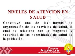 El documento describe los diferentes niveles de atención en salud, incluyendo el primer nivel. Explica que el primer nivel atiende del 70-80% de la población y se enfoca en la promoción de la salud, prevención de enfermedades, diagnóstico temprano y tratamiento básico. También enumera las funciones del primer nivel como crear entornos saludables, prevenir riesgos, recuperar la salud y analizar la situación local.