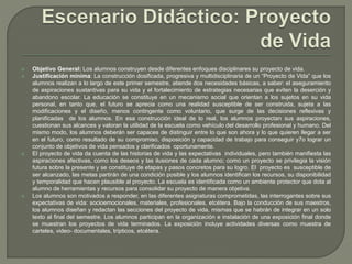 El documento describe una jornada de acompañamiento para el proyecto integrador de primer grado. El objetivo general es que los alumnos construyan su proyecto de vida desde diferentes perspectivas disciplinares. Los alumnos diseñarán y redactarán las secciones de su proyecto de vida en las diferentes asignaturas. Al final del semestre, integrarán su proyecto de vida en un solo texto y participarán en una exposición donde mostrarán sus proyectos terminados.
