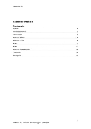 Este documento presenta las reflexiones del equipo Panuchitos sobre las herramientas de Microsoft Office Word, Excel y PowerPoint aprendidas en el tercer bloque. Incluye resúmenes de las actividades de aprendizaje realizadas con cada aplicación y reflexiones sobre sus usos en el ámbito académico y cotidiano. Word fue utilizado para investigaciones y proyectos, mientras que Excel resultó útil para tareas matemáticas y de organización. PowerPoint sirvió para presentaciones visuales. Cada miembro destacó haber aprendido nuevas her