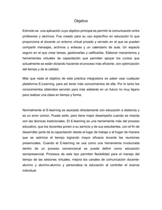 Edmodo es una plataforma educativa que permite a profesores y estudiantes comunicarse y compartir archivos, enlaces y tareas de forma segura. Los profesores pueden crear clases virtuales privadas en Edmodo para administrar calendarios, publicar contenido y evaluar el progreso de los estudiantes continuamente basado en su participación y desempeño en las tareas asignadas. El objetivo principal de Edmodo es mejorar la eficiencia de la enseñanza mediante el uso de herramientas de aprendizaje en línea como complemento de las cl