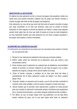 Este documento presenta un proyecto de una aplicación llamada "Game Planet" desarrollada por un equipo de estudiantes para dar a conocer los juegos más populares. Describe el objetivo de la aplicación, los pasos para su diseño e implementación, la interfaz propuesta y capturas de pantalla, y concluye reflexionando sobre lo aprendido en el proceso de desarrollo.
