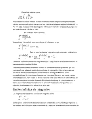 Una integral impropia es el límite de una integral definida cuando uno o ambos extremos del intervalo de integración se acercan a un número real específico, a ∞, o a -∞. Las integrales impropias surgen cuando la función no es continua en todo el intervalo o tiene discontinuidades o asíntotas en los límites de integración. Se pueden clasificar en de primera especie con asíntotas horizontales, de segunda especie con asíntotas verticales, y de tercera especie que son una mezcla de las dos. Para determinar si una integral