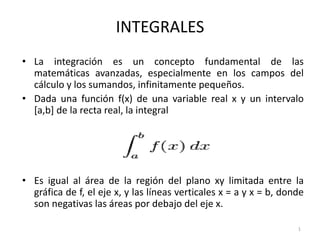 El documento trata sobre conceptos matemáticos avanzados como las integrales y la integración. Explica que la integración es igual al área delimitada entre la gráfica de una función y los límites de integración. Presenta casos prácticos sobre el cálculo de participación de mercado y costos, ingresos y ganancias usando integrales definidas e indefinidas.