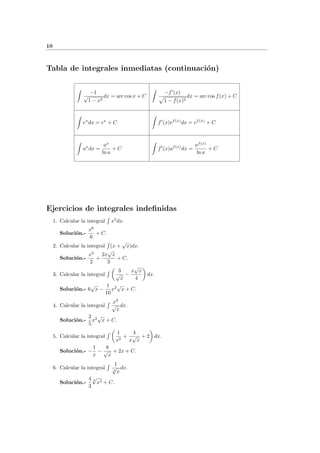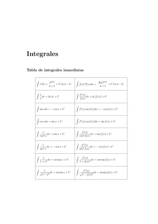 El documento presenta una tabla de integrales inmediatas que incluye funciones como xn, f(x)n, 1/x, sen(x), cos(x), etc. Luego muestra ejemplos de cálculo de integrales indefinidas usando la tabla. Finalmente, introduce la fórmula de integración por partes y ejercicios de su aplicación.