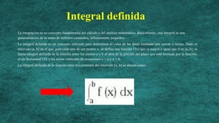 Este documento resume los conceptos fundamentales de las integrales definidas. Explica que una integral definida determina el área limitada por una curva y líneas rectas, y se denota como la integral de una función entre los límites del intervalo. También resume las propiedades de las integrales definidas y introduce la relación entre derivadas e integrales definidas establecida por el teorema fundamental del cálculo.