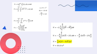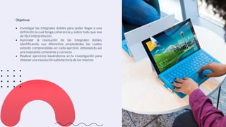 Este documento presenta información sobre integrales dobles. Explica que las integrales dobles se usan para calcular el área de figuras planas y el volumen de sólidos tridimensionales. Proporciona ejemplos de cómo calcular el área bajo una curva y el volumen de un sólido usando integrales dobles. También discute otras aplicaciones como calcular el área de una función escalonada.
