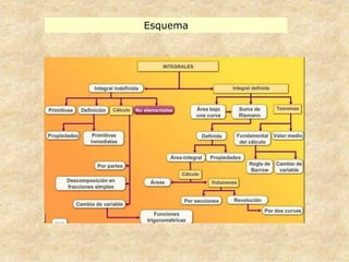 Este documento resume los conceptos fundamentales de las integrales indefinidas. Explica que una integral indefinida representa el conjunto de todas las primitivas de una función, y que las primitivas difieren entre sí en una constante arbitraria. También presenta varios métodos para calcular integrales indefinidas, como integrales inmediatas, integración por partes, sustitución y descomposición de fracciones para integrales racionales.