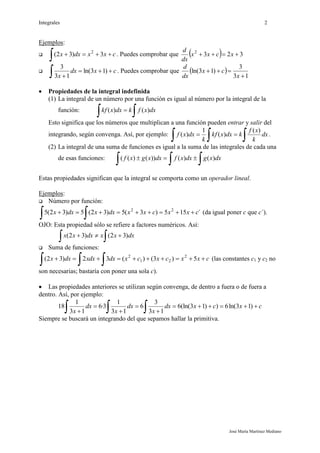 1. El documento explica el concepto de integral indefinida y primitiva. Una primitiva de una función es su antiderivada, y la integral indefinida de una función es la suma de su primitiva y una constante.
