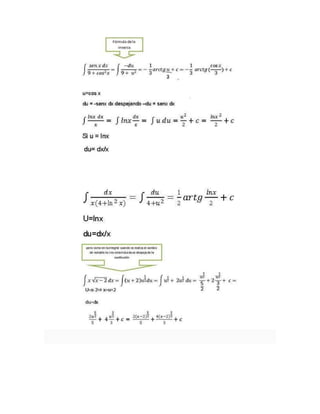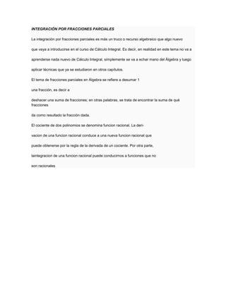 El documento trata sobre diferentes métodos para calcular integrales, incluyendo integrales inmediatas, integración por fracciones parciales, cambio de variable o sustitución, método de integración por partes e integración por sustitución trigonométrica. Explica que cada método se aplica a ciertos tipos de funciones y proporciona ejemplos de su uso.