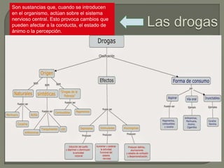 El documento trata sobre diferentes vicios como las drogas, el alcoholismo, la prostitución y el mal uso del celular. Explica que las drogas y el alcohol actúan sobre el sistema nervioso central y pueden afectar la conducta y estado de ánimo. Define el alcoholismo como una enfermedad que causa ansia por beber, pérdida de control e intolerancia. Describe la prostitución como la venta de servicios sexuales a cambio de dinero y las causas que llevan a alguien a ejercerla. Finalmente, señala que el