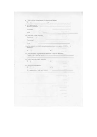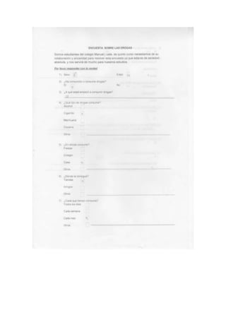 2) Las conclusiones son que muchos jóvenes consumen drogas para solucionar problemas o sentirse valientes, y empiezan a una edad temprana influenciados por amigos.