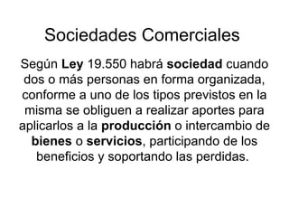 El documento describe los tipos de sociedades comerciales según la Ley 19.550 de Argentina, incluyendo la sociedad de hecho, sociedad colectiva, sociedad de responsabilidad limitada y sociedad anónima. También discute la posibilidad de implementar la sociedad unipersonal en Argentina y compara esta figura en el derecho francés.