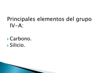 El documento proporciona información sobre los integrantes del grupo Yeri Beltré y Luige Deogracia. Luego resume las propiedades del carbono y el silicio, incluyendo sus descubridores, estados naturales, propiedades físicas y químicas, métodos de obtención y usos. El carbono existe en varias formas como grafito y diamante, mientras que el silicio es el segundo elemento más abundante en la corteza terrestre. Ambos elementos juegan un papel importante en la industria.