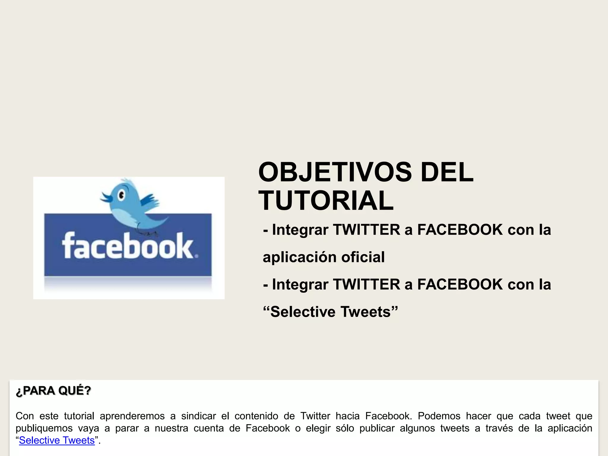 Este documento explica cómo integrar Twitter con Facebook de dos maneras: 1) Usando la aplicación oficial para publicar todos los tweets en Facebook; 2) Usando la aplicación "Selective Tweets" para elegir qué tweets publicar en Facebook agregando el hashtag #fb. El propósito es sindicar el contenido de Twitter a Facebook.