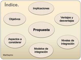 La propuesta busca integrar las TICs en el aula para permitir un aprendizaje más individualizado y cooperativo aprovechando los recursos disponibles. Se proponen objetivos como aumentar la capacidad de procesar información y trabajar de forma conjunta. Se detallan las implicaciones para el centro, docente y alumno, así como ventajas y desventajas de la integración. Finalmente, se explican niveles y modelos para incluir las TICs en el currículo escolar.