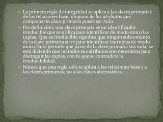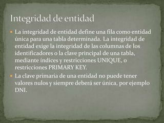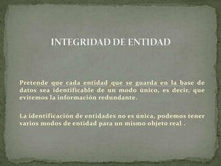 Este documento describe los conceptos de integridad de entidad y referencial en bases de datos. La integridad de entidad requiere que cada entidad sea identificable de manera única para evitar información redundante, mientras que la integridad referencial protege las relaciones entre tablas al eliminar o agregar filas.