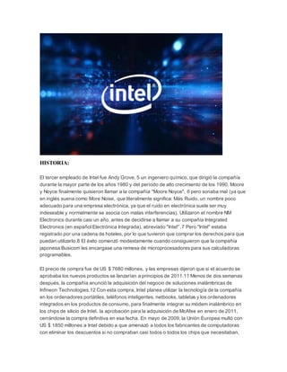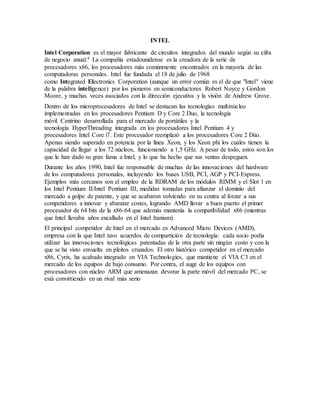 Intel Corporation es el mayor fabricante de circuitos integrados del mundo. Fundada en 1968, Intel creó la serie de procesadores x86 que se encuentran en la mayoría de computadoras personales. A lo largo de los años, Intel ha liderado innovaciones en hardware de computadoras personales e implementado tecnologías como los procesadores multicore y Centrino. Su principal competidor es Advanced Micro Devices.