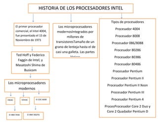 Este documento presenta una breve historia de los principales procesadores Intel desde el primer procesador comercial Intel 4004 en 1971 hasta los procesadores Core 2 Duo y Core 2 Quad. También menciona otros hitos importantes en el desarrollo de los procesadores como el ENIAC, EDVAC e IBM 360/91.