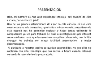 Este documento presenta un programa de capacitación en computación para estudiantes de una escuela rural en México. El programa les permite a los estudiantes explorar y completar tareas utilizando computadoras, lo que facilita la presentación y documentación de sus trabajos. Los estudiantes están aprendiendo habilidades valiosas de computación que los ayudarán en el futuro. Agradecen tener acceso a esta tecnología a través de un programa comunitario y de Intel que les proporciona las herramientas necesarias.